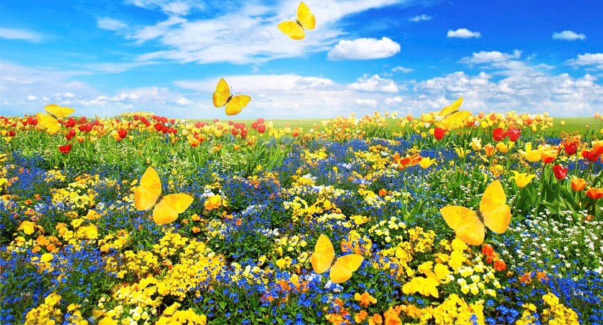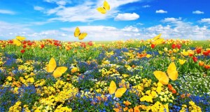 meadow with assorted flowers and butterflies