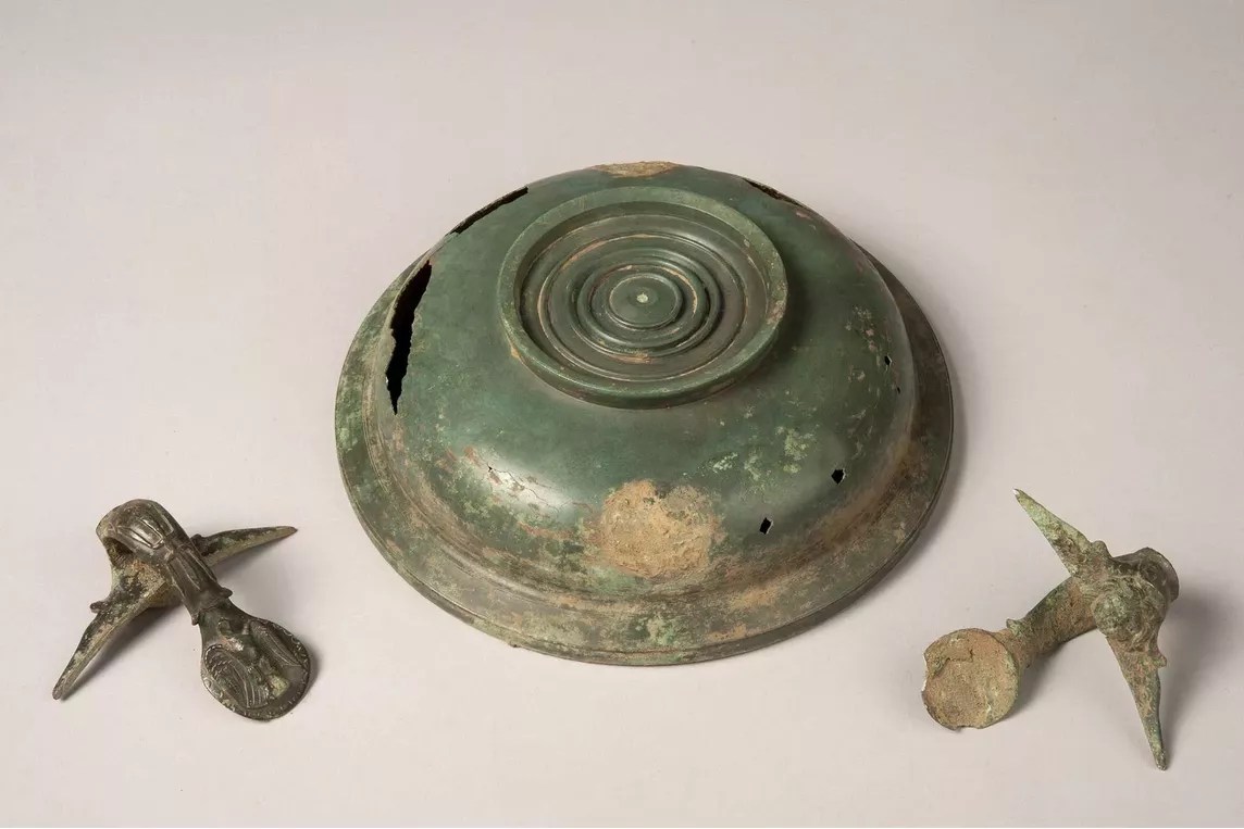-1- Two Gallo-Roman sanctuaries were discovered near Rennes, two fanas located in the center of the complex. The largest fanum was to reveive one or more tutelary deities, while the smallest was to be intended for secondary deities. Very important therefore, for our understanding of ancient rites. Many votive offerings were found, such as this magnificent bronze cup with two carved handles. Or a superb statue of the Roman god Mars, in bronze, fibulae, funeral urns dating back to -500 (before our era), 150 coins…