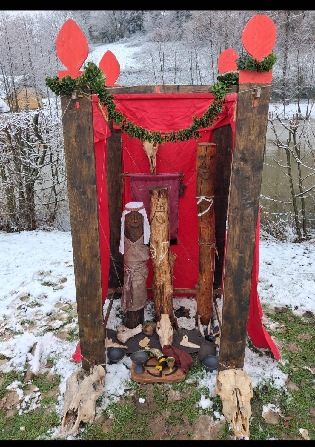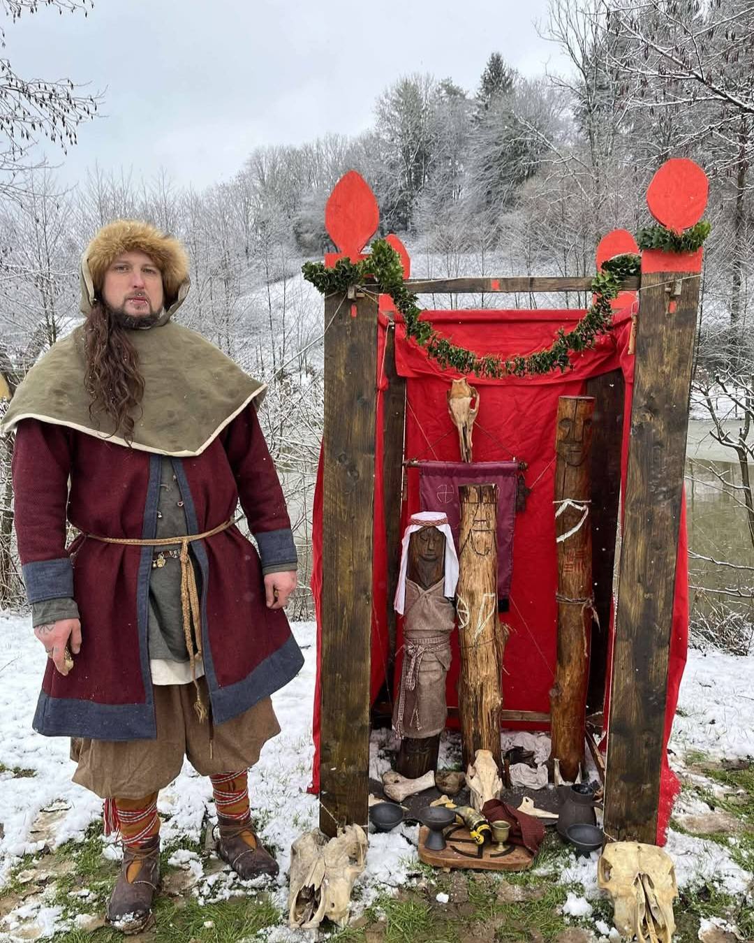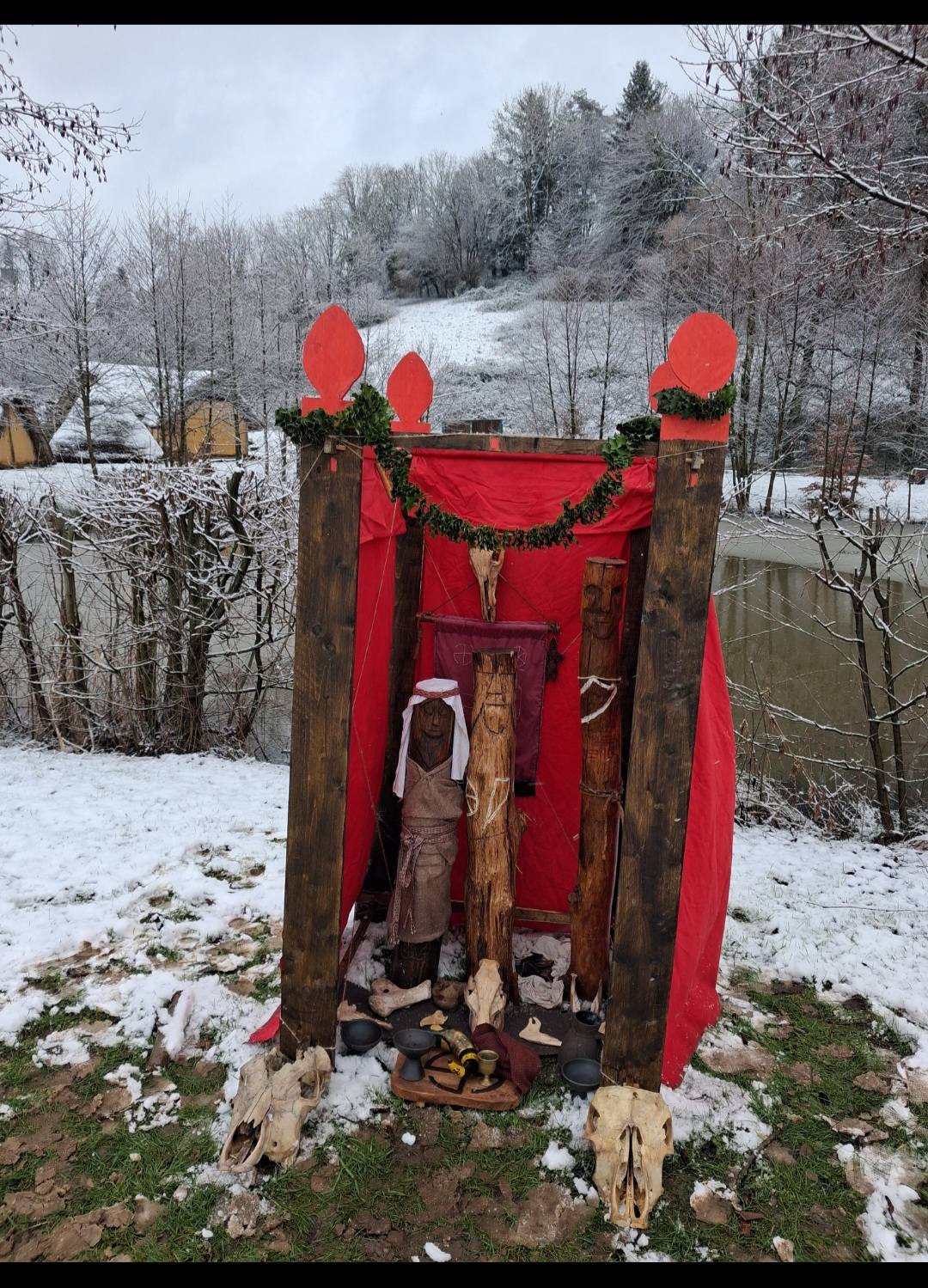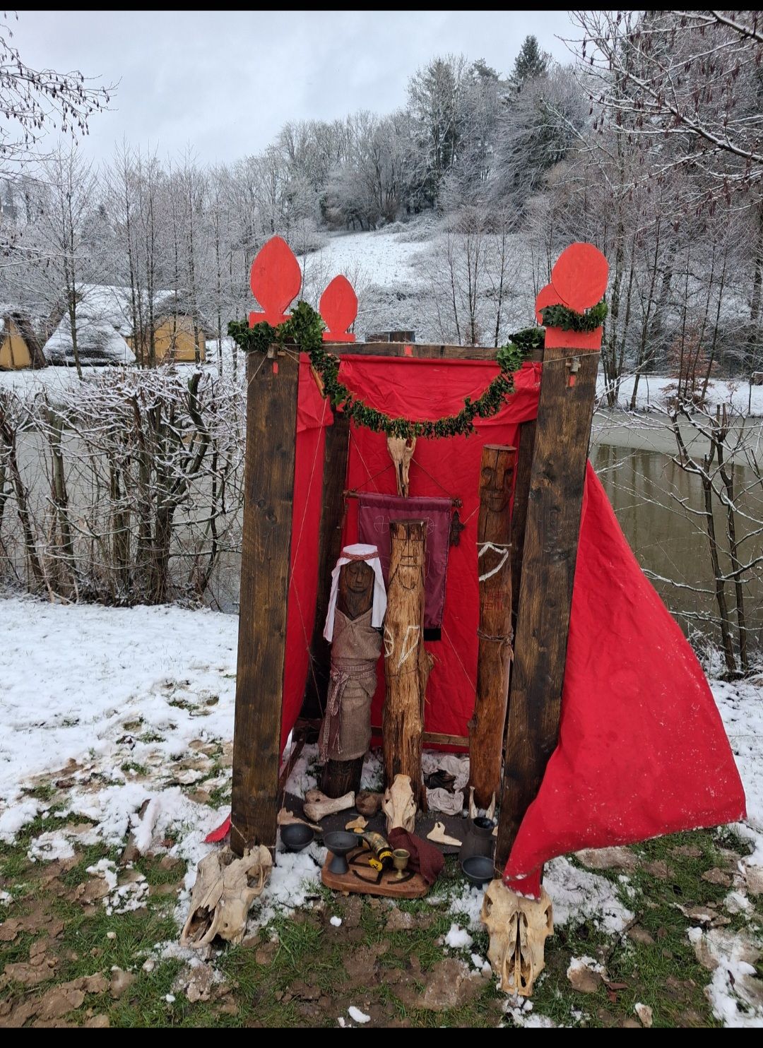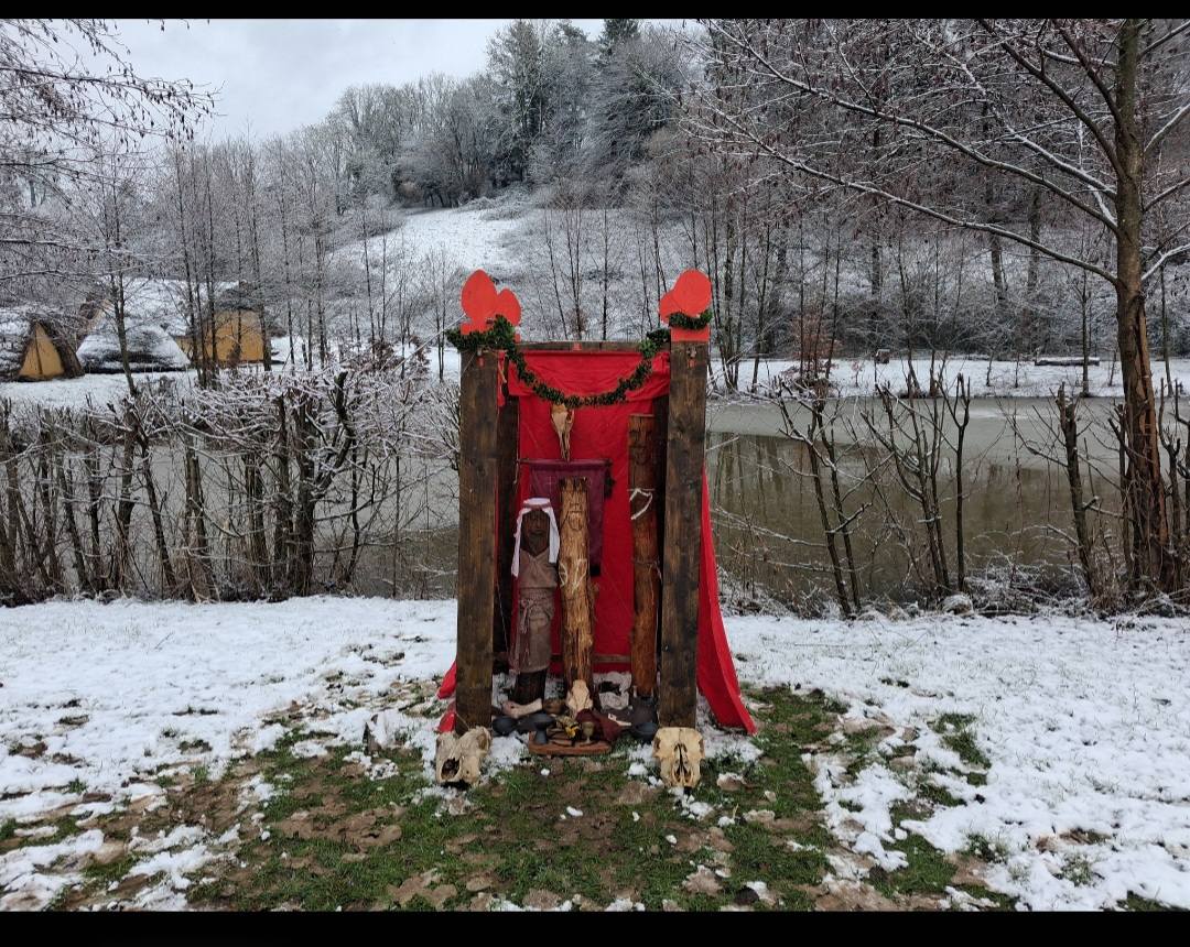 -Here is my Slavic temple during reenactment. Inspired by Swarozic’s temple of GroB Raden (Germany). Offerings arerealised 3 times per day to honor Swarozic, Mokosz, Svetovit. But also Perun, Dazbog and good local spirits. It’s a real pleasure to be so close to the Gods with historical things.